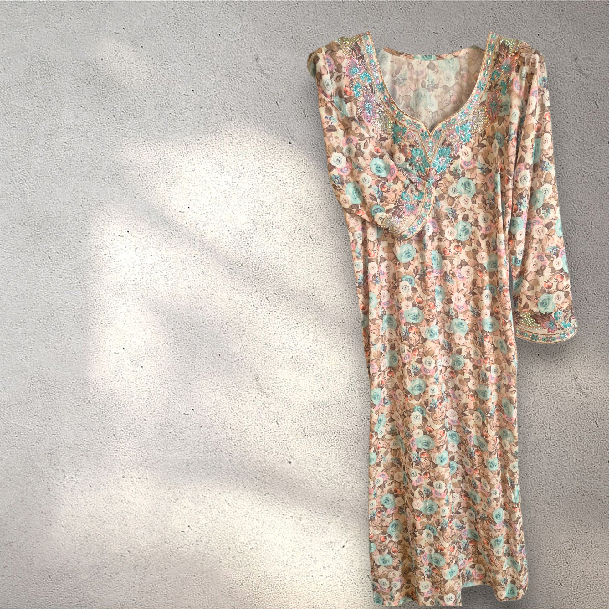 A garden in bloom, full of joy and gentle celebration — this cotton mukhawar is made for the moments that matter. Soft florals drift across a pale base, stitched with care and subtle sparkle to honour the beauty of both everyday grace and special days alike.