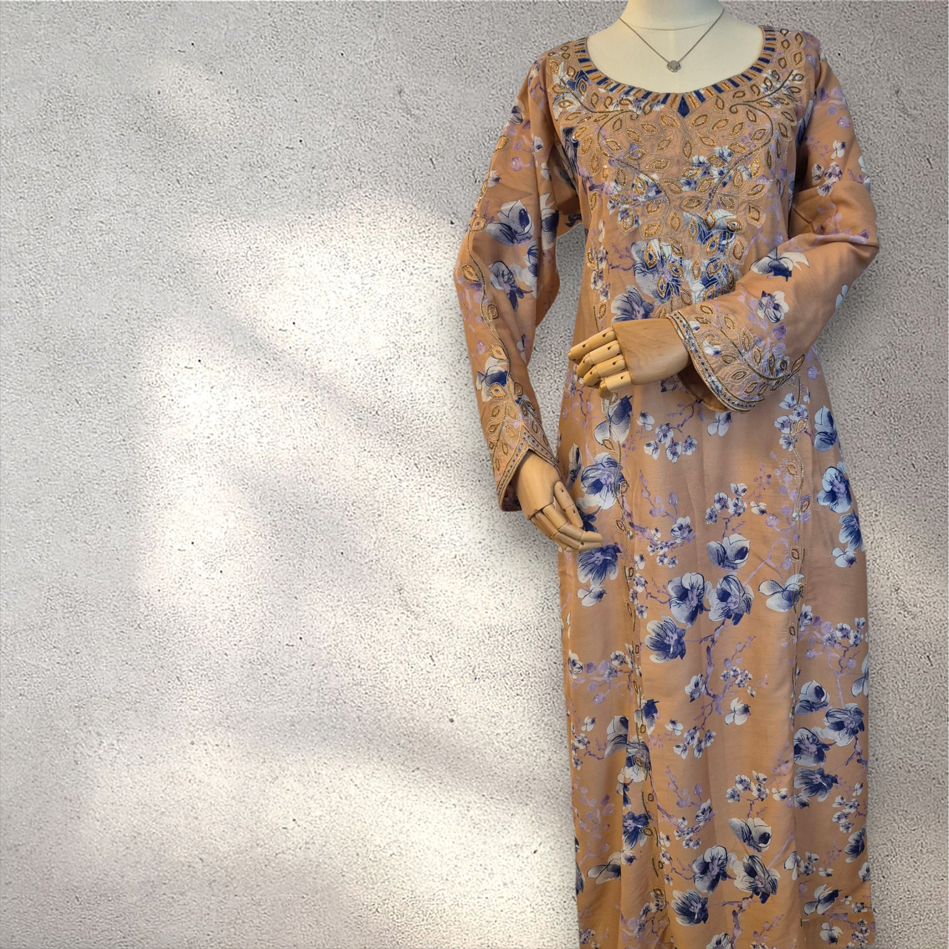 A timeless blend of warmth and shimmer — Amber Bloom is a cotton mukhawar that pairs golden florals with full crystal detailing along the chest and sleeves. Hand-finished embroidery glimmers gently across the caramel-toned base, while cool lilac and deep blue blossoms add depth and contrast.