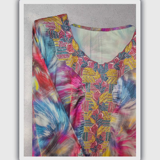 A kaleidoscope in silk — this mukhawar lives somewhere between dream and statement. With vivid jewel tones dancing across the fabric and hand embroidery that glimmers in gold, this piece brings boldness and fluidity together in a single breath.