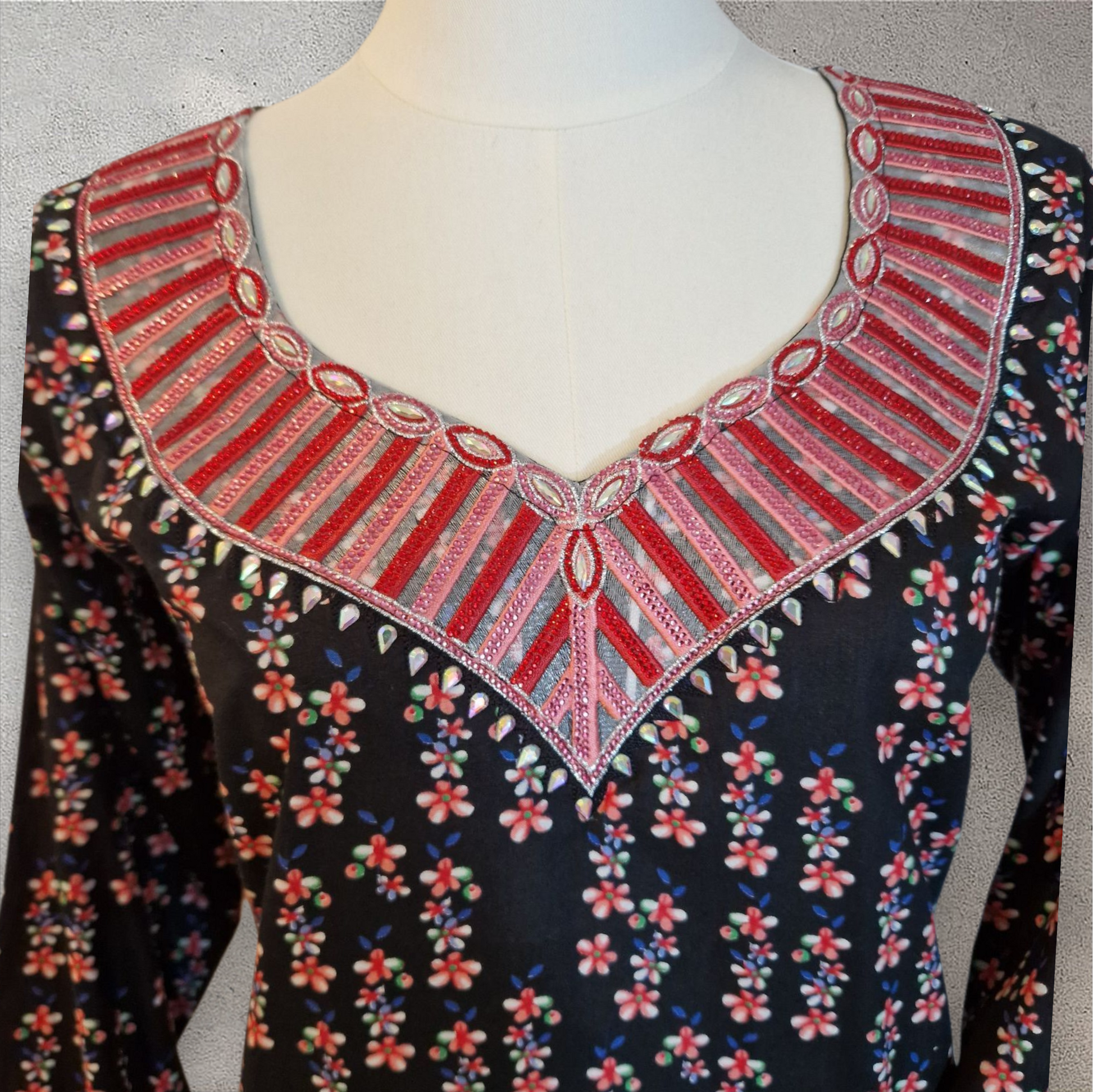 The deep black base is balanced with delicate floral accents, while hand-finished embroidery adds a touch of heritage charm. Light, breathable, and quietly elegant, it’s a piece that whispers rather than shouts.