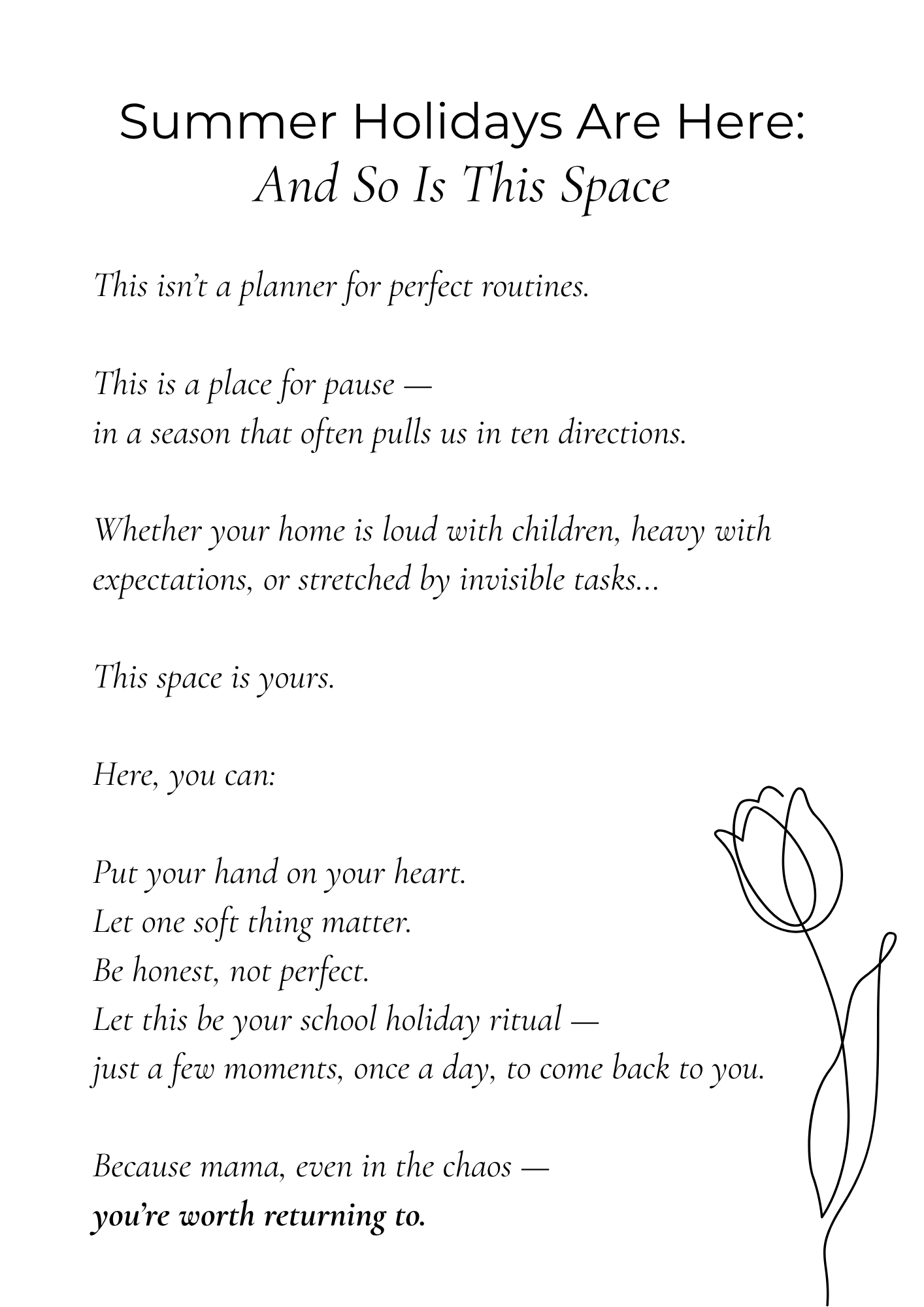 A soft, soulful digital journal for the mother who’s trying. This is not a productivity tool — it's a place to pause, reflect, and gently return to yourself through the school holidays.