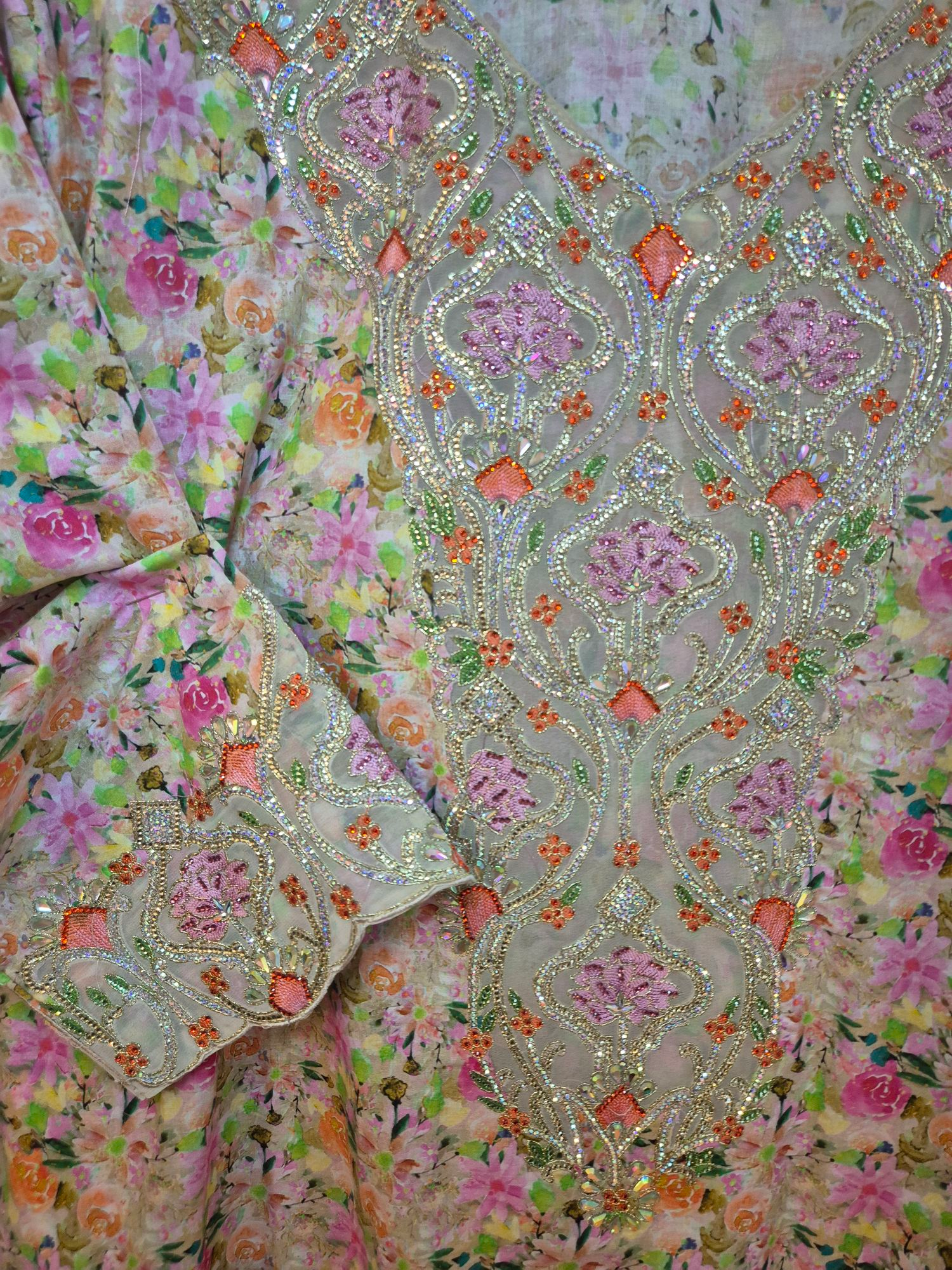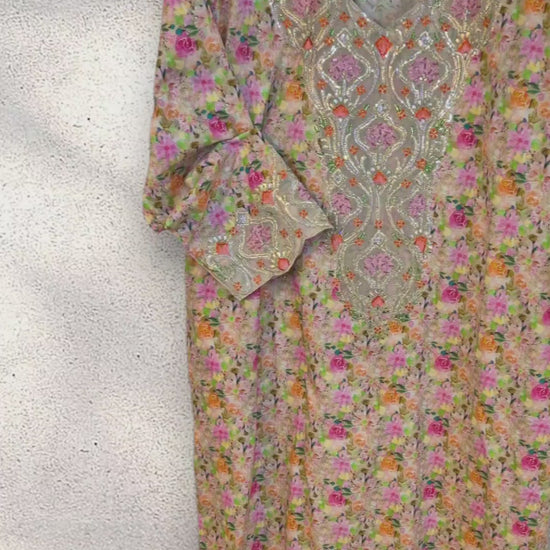 Like scattered petals caught in motion, this cotton mukhawar is a gentle celebration of colour and craft. The print evokes the artistry of a mosaic — soft, detailed, and full of warmth — while hand-finished embroidery adds a final flourish of texture.
