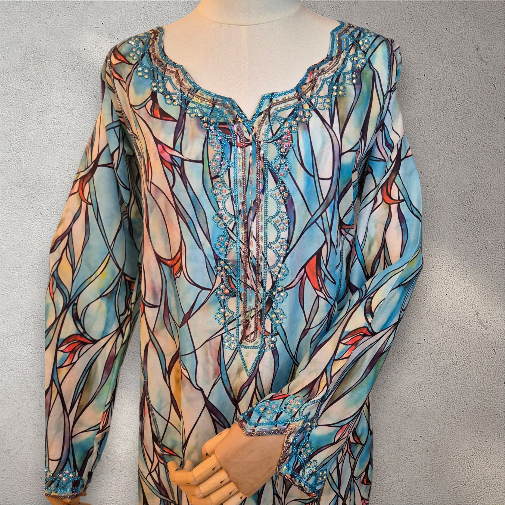 The print is reminiscent of stained glass kissed by sun and sea, with embroidery scattered delicately along the neckline and cuffs like shimmering dew.