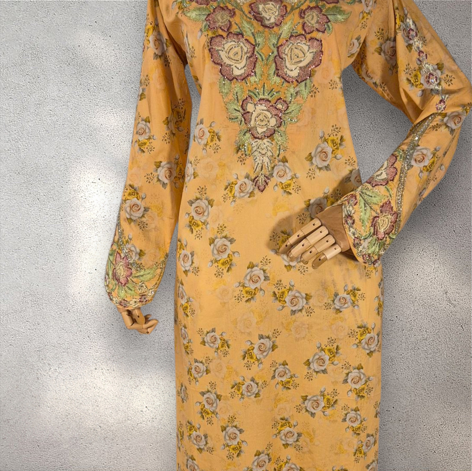 Golden warmth stitched with floral grace — Sunlit Rose is a cotton mukhawar that feels like a soft blessing. With rose embroidery in dusty blush, sage, and cream set against a warm saffron base, this piece speaks of joy, stillness, and tradition. Finished by hand in the Emirates, it's made for moments that feel like home.
